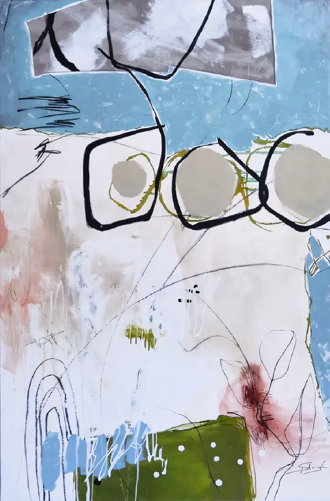 (In meinen Bildern haben Formen, Farben und Ihre Kontraste den Fokus. Durch das Spielen mit dem Material, dem Zufall und dem Loslassen, bringe ich die Leichtigkeit zum Ausdruck.)